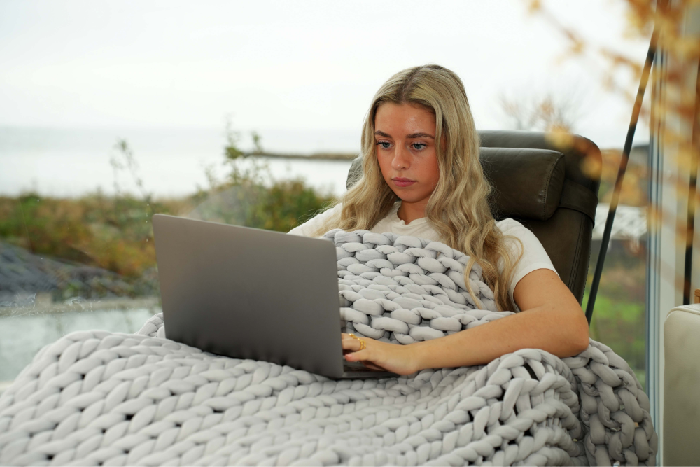 Det skønneste vægttæppe i et flettet mønster. Tæppet er med til at give ro, afslapning og velvære grundet vægten, samtidig med det er pænt at have liggende fremme. Tæppet kan efter brug pynte på sofaen eller som et sengetæppe.